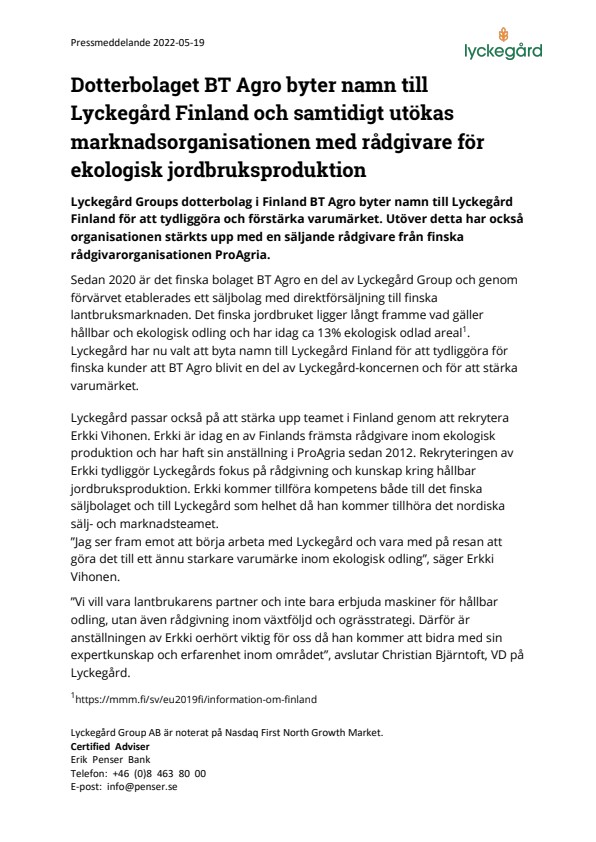Sedan 2020 är det finska bolaget BT Agro en del av Lyckegård Group och genom förvärvet etablerades ett säljbolag med direktförsäljning till finska lantbruksmarknaden. Det finska jordbruket ligger långt framme vad gäller hållbar och ekologisk odling och har idag ca 13% ekologisk odlad areal1. Lyckegård har nu valt att byta namn till Lyckegård Finland för att tydliggöra för finska kunder att BT Agro blivit en del av Lyckegård-koncernen och för att stärka varumärket.