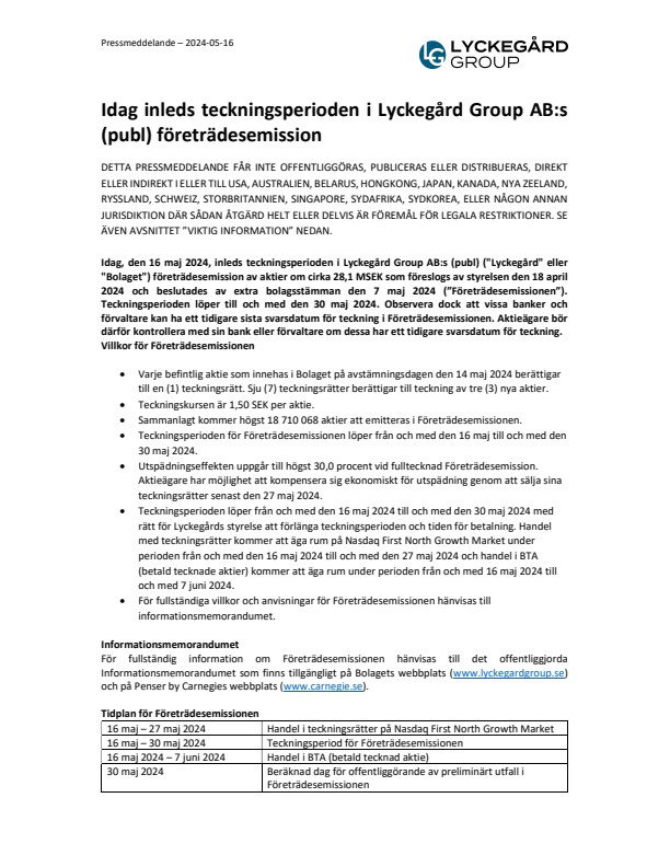 Idag, den 16 maj 2024, inleds teckningsperioden i Lyckegård Group AB:s (publ) (”Lyckegård” eller ”Bolaget”) företrädesemission av aktier om cirka 28,1 MSEK som föreslogs av styrelsen den 18 april 2024 och beslutades av extra bolagsstämman den 7 maj 2024 (”Företrädesemissionen”). Teckningsperioden löper till och med den 30 maj 2024. Observera dock att vissa banker och förvaltare kan ha ett tidigare sista svarsdatum för teckning i Företrädesemissionen. Aktieägare bör därför kontrollera med sin bank eller förvaltare om dessa har ett tidigare svarsdatum för teckning.