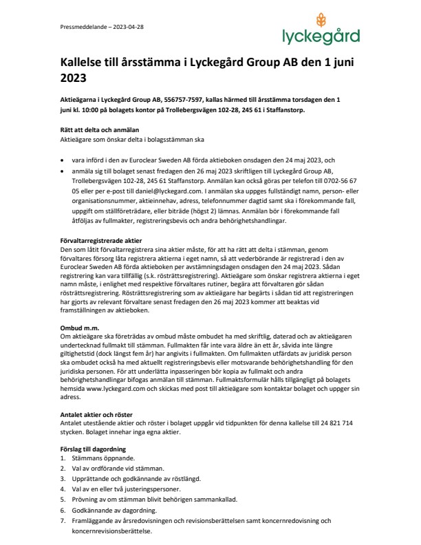 Aktieägarna i Lyckegård Group AB, 556757-7597, kallas härmed till årsstämma torsdagen den 1 juni kl. 10:00 på bolagets kontor på Trollebergsvägen 102-28, 245 61 i Staffanstorp.