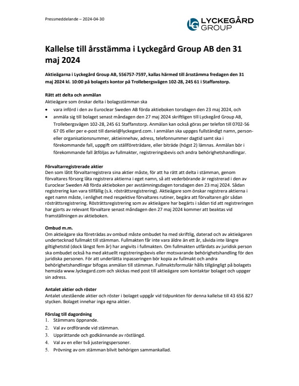 Aktieägarna i Lyckegård Group AB, 556757-7597, kallas härmed till årsstämma fredagen den 31 maj 2024 kl. 10:00 på bolagets kontor på Trollebergsvägen 102-28, 245 61 i Staffanstorp.
