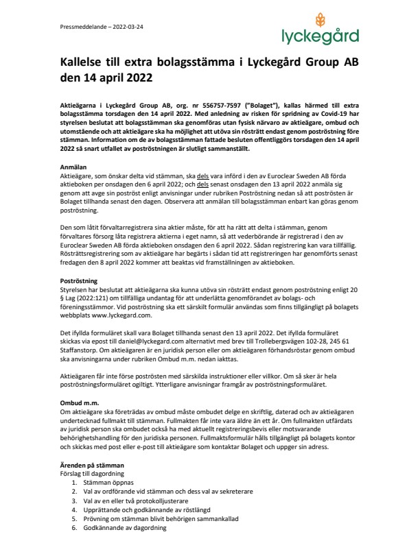 Aktieägarna i Lyckegård Group AB, org. nr 556757-7597 (”Bolaget”), kallas härmed till extra bolagsstämma torsdagen den 14 april 2022. Med anledning av risken för spridning av Covid-19 har styrelsen beslutat att bolagsstämman ska genomföras utan fysisk närvaro av aktieägare, ombud och utomstående och att aktieägare ska ha möjlighet att utöva sin rösträtt endast genom poströstning före stämman. Information om de av bolagsstämman fattade besluten offentliggörs torsdagen den 14 april 2022 så snart utfallet av poströstningen är slutligt sammanställt.