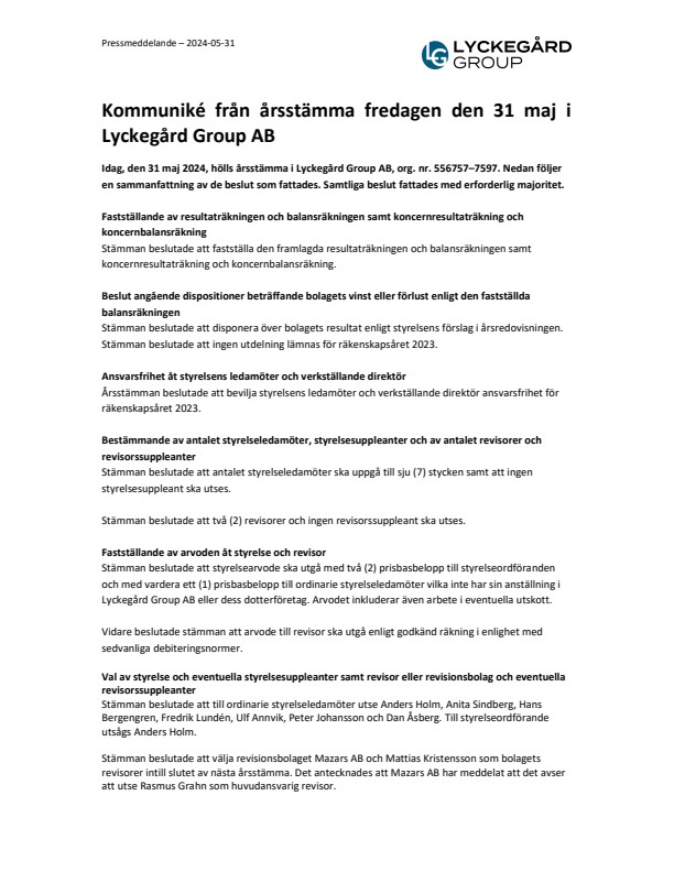 Idag, den 31 maj 2024, hölls årsstämma i Lyckegård Group AB, org. nr. 556757–7597. Nedan följer en sammanfattning av de beslut som fattades. Samtliga beslut fattades med erforderlig majoritet.