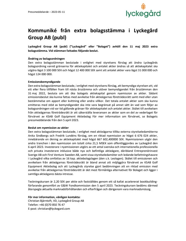 Den extra bolagsstämman beslutade, i enlighet med aktieägarna tillika externa styrelseledamöterna Anita Sindbergs och Fredrik Lundéns förslag, om en riktad nyemission av högst 6 676 024 aktier, innebärande en ökning av aktiekapitalet med högst 667 602,400000 SEK. Nyemissionen utgör den andra tranchen i den nyemission om totalt cirka 21,5 MSEK som offentliggjordes av Lyckegård den 6 april 2023. Investerare i nyemissionen utgörs av ett antal svenska och internationella professionella och privata investerare inklusive både nya och befintliga aktieägare, däribland Entreprenörinvest Sverige AB och First Venture Sweden AB, samt vissa styrelseledamöter och ledande befattningshavare i Lyckegård vilka omfattas av 16 kap. aktiebolagslagen (den s.k. Leolagen). Skälet till emissionen och avvikelsen från aktieägarnas företrädesrätt är bland annat att möjliggöra förvärvet av KSAB Golf Equipment Aktiebolag och att Lyckegårds styrelse gjort bedömningen att en riktad emission med avvikelse från aktieägarnas företrädesrätt är det mest förmånliga alternativet för Bolaget och ligger i samtliga aktieägares bästa intresse.