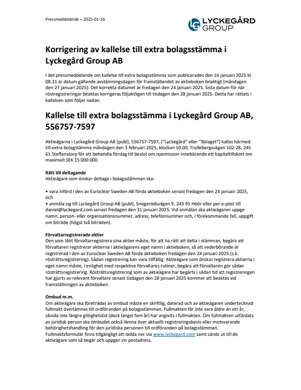 Aktieägarna i Lyckegård Group AB (publ), 556757-7597, (”Lyckegård” eller ”Bolaget”) kallas härmed till extra bolagstämma måndagen den 3 februari 2025, klockan 10.00, Trollebergsvägen 102-28, 245 61 Staffanstorp för att behandla förslag till beslut om nyemission innebärande ett kapitaltillskott om maximalt SEK 15 000 000.