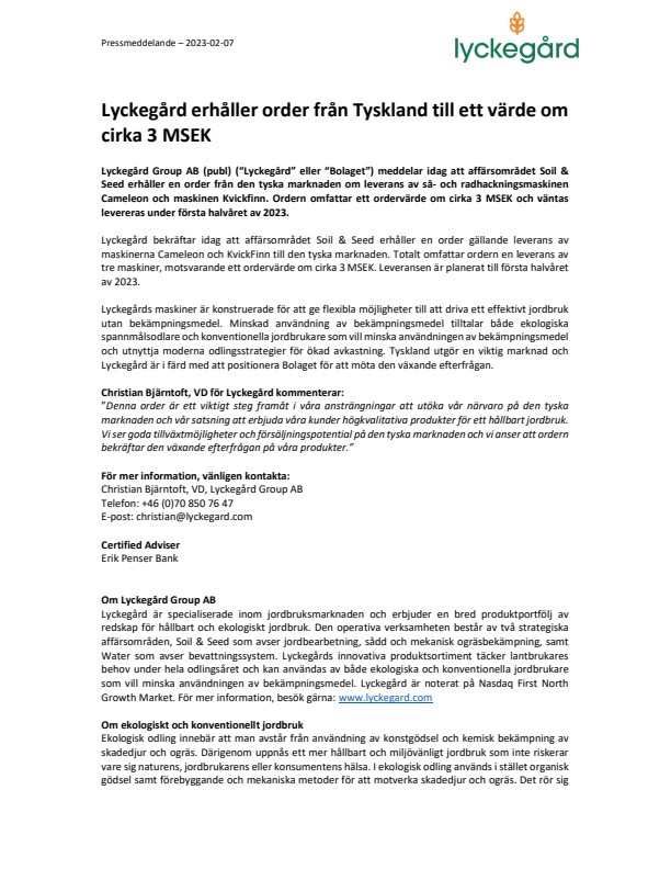 Lyckegård Group AB (publ) (“Lyckegård” eller “Bolaget”) meddelar idag att affärsområdet Soil & Seed erhåller en order från den tyska marknaden om leverans av så- och radhackningsmaskinen Cameleon och maskinen Kvickfinn. Ordern omfattar ett ordervärde om cirka 3 MSEK och väntas levereras under första halvåret av 2023.