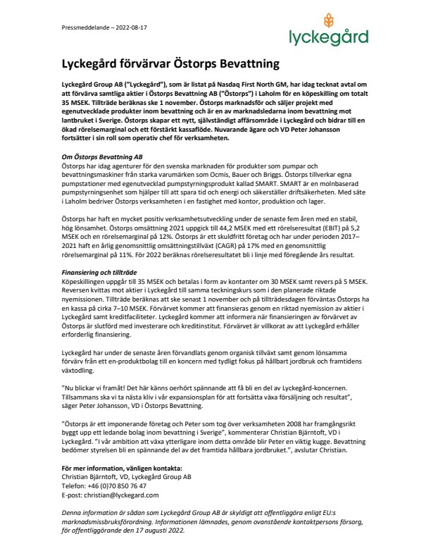 Lyckegård Group AB (”Lyckegård”), som är listat på Nasdaq First North GM, har idag tecknat avtal om att förvärva samtliga aktier i Östorps Bevattning AB (”Östorps”) i Laholm för en köpeskilling om totalt 35 MSEK. Tillträde beräknas ske 1 november. Östorps marknadsför och säljer projekt med egenutvecklade produkter inom bevattning och är en av marknadsledarna inom bevattning mot lantbruket i Sverige. Östorps skapar ett nytt, självständigt affärsområde i Lyckegård och bidrar till en ökad rörelsemarginal och ett förstärkt kassaflöde. Nuvarande ägare och VD Peter Johansson fortsätter i sin roll som operativ chef för verksamheten.