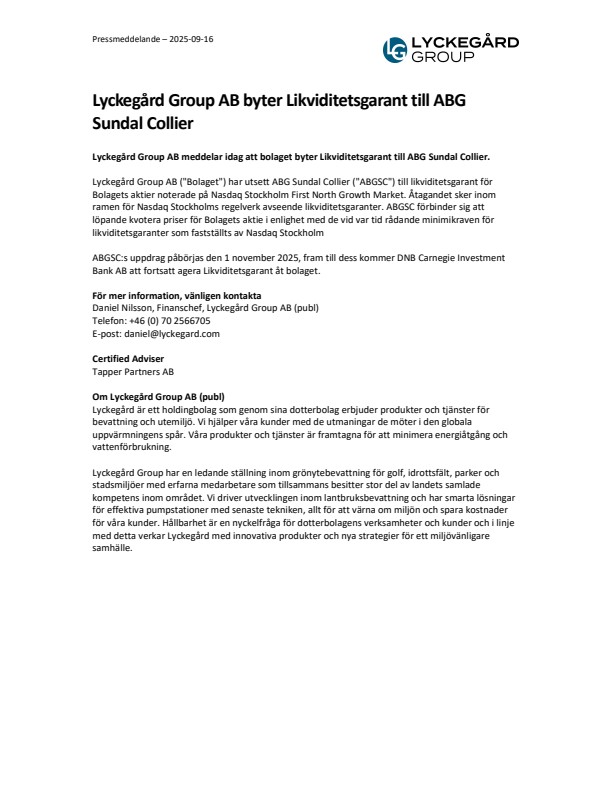 Lyckegård Group AB meddelar idag att bolaget byter Likviditetsgarant till ABG Sundal Collier.