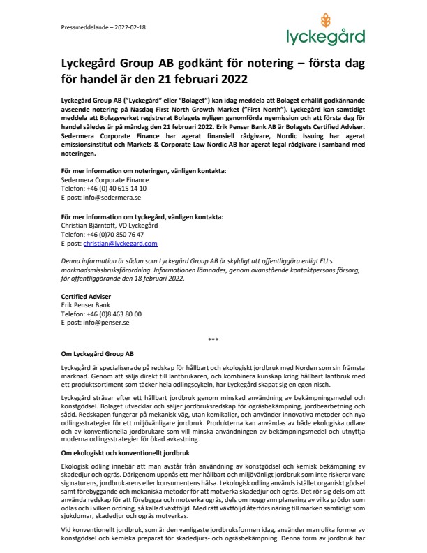 Lyckegård Group AB (”Lyckegård” eller “Bolaget”) kan idag meddela att Bolaget erhållit godkännande avseende notering på Nasdaq First North Growth Market (”First North”). Lyckegård kan samtidigt meddela att Bolagsverket registrerat Bolagets nyligen genomförda nyemission och att första dag för handel således är på måndag den 21 februari 2022. Erik Penser Bank AB är Bolagets Certified Adviser. Sedermera Corporate Finance har agerat finansiell rådgivare, Nordic Issuing har agerat emissionsinstitut och Markets & Corporate Law Nordic AB har agerat legal rådgivare i samband med noteringen.