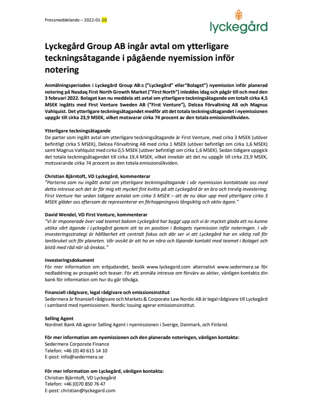 Anmälningsperioden i Lyckegård Group AB:s (”Lyckegård” eller “Bolaget”) nyemission inför planerad notering på Nasdaq First North Growth Market (”First North”) inleddes idag och pågår till och med den 3 februari 2022. Bolaget kan nu meddela att avtal om ytterligare teckningsåtagande om totalt cirka 4,5 MSEK ingåtts med First Venture Sweden AB (”First Venture”), Delcea Förvaltning AB och Magnus Vahlquist. Det ytterligare teckningsåtagandet medför att det totala teckningsåtagandet i nyemissionen uppgår till cirka 23,9 MSEK, vilket motsvarar cirka 74 procent av den totala emissionslikviden.