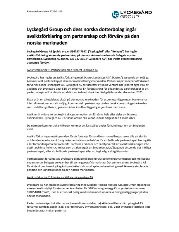 Lyckegård har ingått en avsiktsförklaring med Skaaret Landskap AS (”Skaaret”) avseende ett möjligt kommersiellt partnerskap på den norska bevattningsmarknaden. Partnerskapet innebär att Skaaret förvärvar aktier i Lyckegård AS. Lyckegård AS blir därefter ett joint-venture där Skaaret äger 49% av aktierna och Lyckegård äger 51% av aktierna. En förutsättning för bildandet av partnerskapet är att parterna ingår ett bindande avtal därom. Avtalet förväntas färdigställas under december 2025.