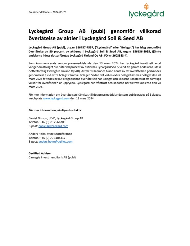 Lyckegård Group AB (publ), org.nr 556757-7597, (”Lyckegård” eller ”Bolaget”) har idag genomfört överlåtelse av 80 procent av aktierna i Lyckegård Soil & Seed AB, org.nr 556136-8035, (jämte andelarna i dess dotterföretag Lyckegård Finland Oy AB, FO-nr 2603583-4).