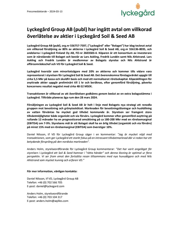 Lyckegård Group AB (publ), org.nr 556757-7597, (”Lyckegård” eller ”Bolaget”) har idag tecknat avtal om villkorad försäljning av 80% av aktierna i Lyckegård Soil & Seed AB, org.nr 556136-8035, och andelarna i Lyckegård Finland Oy AB, FO-nr 2603583-4. Köparen är ett konsortium av investerare som är närstående till Bolaget och består av Lars Askling, Fredrik Lundén samt Nils Ahlstrand. Lars Askling och Fredrik Lundén är medlemmar av Bolagets styrelse och Nils Ahlstrand är affärsområdeschef och VD för Lyckegård Soil & Seed.