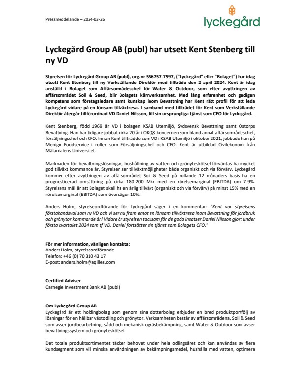 Styrelsen för Lyckegård Group AB (publ), org.nr 556757-7597, (”Lyckegård” eller ”Bolaget”) har idag utsett Kent Stenberg till ny Verkställande Direktör med tillträde den 2 april 2024. Kent är idag anställd i Bolaget som Affärsområdeschef för Water & Outdoor, som efter avyttringen av affärsområdet Soil & Seed, blir Bolagets kärnverksamhet. Med lång erfarenhet och gedigen kompetens som företagsledare samt kunskap inom Bevattning har Kent rätt profil för att leda Lyckegård vidare på en lönsam tillväxtresa. I samband med tillträdet för Kent som Verkställande Direktör återgår tillförordnad VD Daniel Nilsson, till sin ursprungliga tjänst som CFO för Lyckegård.