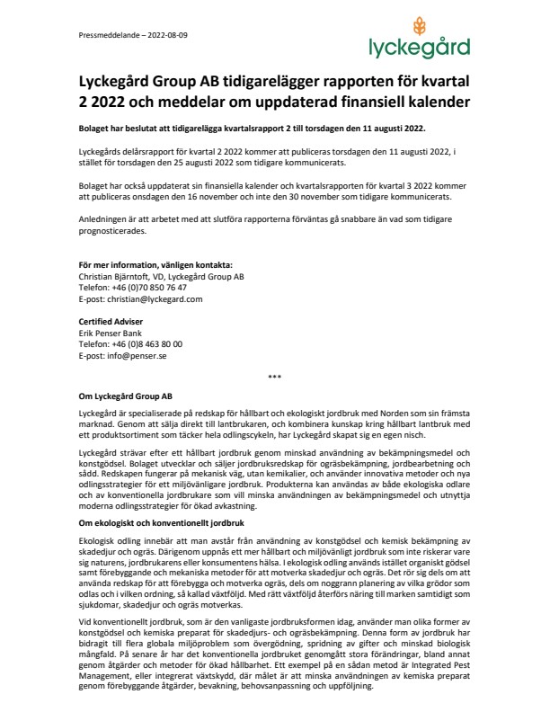 Lyckegårds delårsrapport för kvartal 2 2022 kommer att publiceras torsdagen den 11 augusti 2022, i stället för torsdagen den 25 augusti 2022 som tidigare kommunicerats.