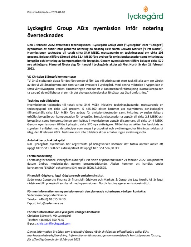 Den 3 februari 2022 avslutades teckningstiden i Lyckegård Group AB:s (”Lyckegård” eller “Bolaget”) nyemission av aktier inför planerad notering på Nasdaq First North Growth Market (”First North”). Nyemissionen tecknades till totalt cirka 34,9 MSEK, motsvarande en teckningsgrad om cirka 108 procent. Bolaget tillförs därmed cirka 32,4 MSEK före avdrag för emissionskostnader samt kvittning av brygglån och kvittning av kompensation för brygglån. Genom nyemissionen tillförs Bolaget cirka 570 nya aktieägare. Planerad första dag för handel i Lyckegårds aktier på First North är den 21 februari 2022.