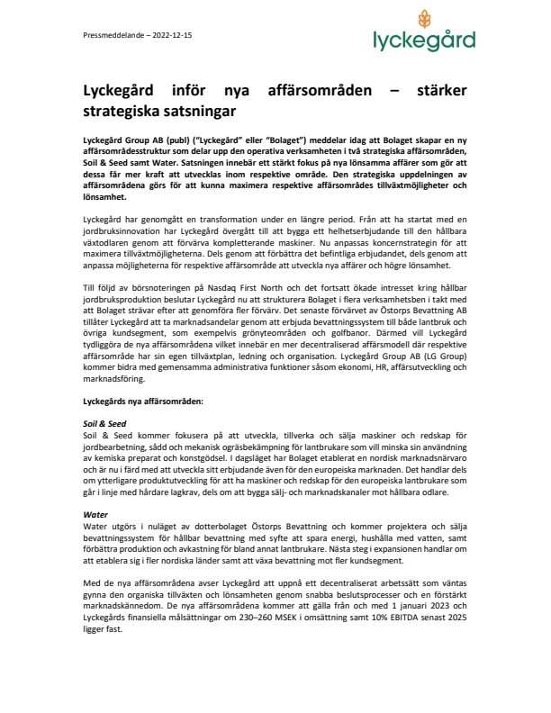 Lyckegård Group AB (publ) (“Lyckegård” eller “Bolaget”) meddelar idag att Bolaget skapar en ny affärsområdesstruktur som delar upp den operativa verksamheten i två strategiska affärsområden, Soil & Seed samt Water. Satsningen innebär ett stärkt fokus på nya lönsamma affärer som gör att dessa får mer kraft att utvecklas inom respektive område. Den strategiska uppdelningen av affärsområdena görs för att kunna maximera respektive affärsområdes tillväxtmöjligheter och lönsamhet.