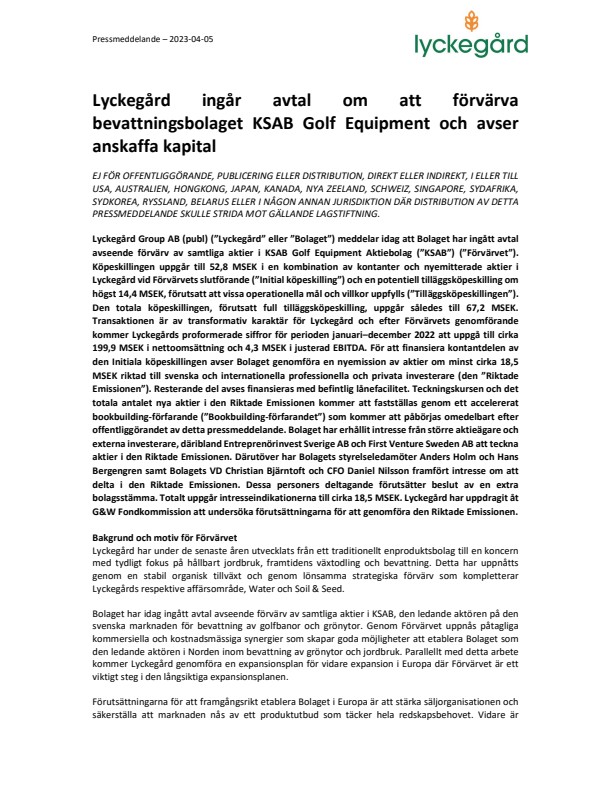 Lyckegård Group AB (publ) (”Lyckegård” eller ”Bolaget”) meddelar idag att Bolaget har ingått avtal avseende förvärv av samtliga aktier i KSAB Golf Equipment Aktiebolag (”KSAB”) (”Förvärvet”). Köpeskillingen uppgår till 52,8 MSEK i en kombination av kontanter och nyemitterade aktier i Lyckegård vid Förvärvets slutförande (”Initial köpeskilling”) och en potentiell tilläggsköpeskilling om högst 14,4 MSEK, förutsatt att vissa operationella mål och villkor uppfylls (”Tilläggsköpeskillingen”). Den totala köpeskillingen, förutsatt full tilläggsköpeskilling, uppgår således till 67,2 MSEK. Transaktionen är av transformativ karaktär för Lyckegård och efter Förvärvets genomförande kommer Lyckegårds proformerade siffror för perioden januari–december 2022 att uppgå till cirka 199,9 MSEK i nettoomsättning och 4,3 MSEK i justerad EBITDA. För att finansiera kontantdelen av den Initiala köpeskillingen avser Bolaget genomföra en nyemission av aktier om minst cirka 18,5 MSEK riktad till svenska och internationella professionella och privata investerare (den ”Riktade Emissionen”). Resterande del avses finansieras med befintlig lånefacilitet. Teckningskursen och det totala antalet nya aktier i den Riktade Emissionen kommer att fastställas genom ett accelererat bookbuilding-förfarande (”Bookbuilding-förfarandet”) som kommer att påbörjas omedelbart efter offentliggörandet av detta pressmeddelande. Bolaget har erhållit intresse från större aktieägare och externa investerare, däribland Entreprenörinvest Sverige AB och First Venture Sweden AB att teckna aktier i den Riktade Emissionen. Därutöver har Bolagets styrelseledamöter Anders Holm och Hans Bergengren samt Bolagets VD Christian Bjärntoft och CFO Daniel Nilsson framfört intresse om att delta i den Riktade Emissionen. Dessa personers deltagande förutsätter beslut av en extra bolagsstämma. Totalt uppgår intresseindikationerna till cirka 18,5 MSEK. Lyckegård har uppdragit åt G&W Fondkommission att undersöka förutsättningarna för att genomföra den Riktade Emissionen.