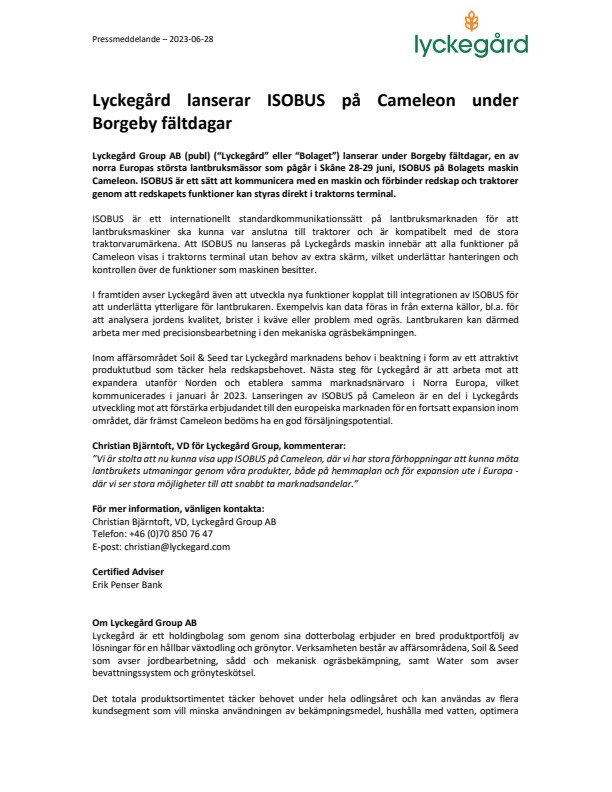 Lyckegård Group AB (publ) (“Lyckegård” eller “Bolaget”) lanserar under Borgeby fältdagar, en av norra Europas största lantbruksmässor som pågår i Skåne 28-29 juni, ISOBUS på Bolagets maskin Cameleon. ISOBUS är ett sätt att kommunicera med en maskin och förbinder redskap och traktorer genom att redskapets funktioner kan styras direkt i traktorns terminal.
