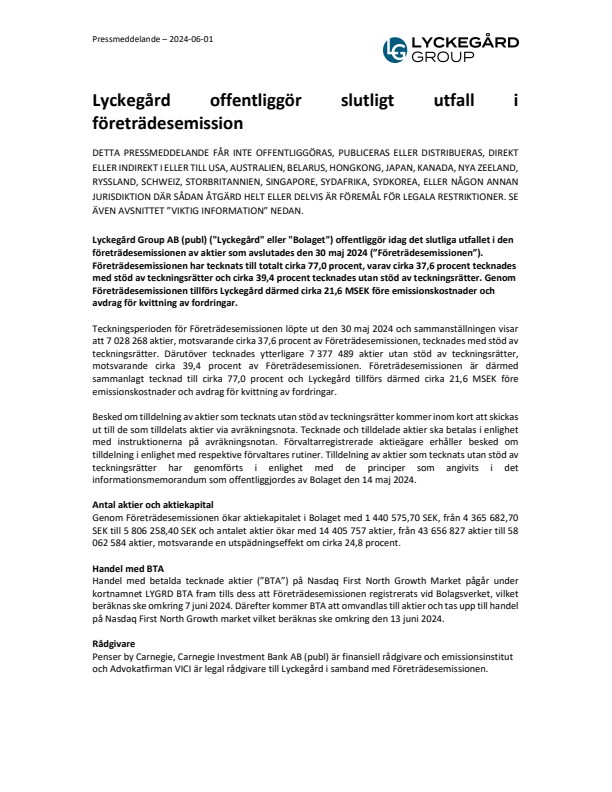 Lyckegård Group AB (publ) (”Lyckegård” eller ”Bolaget”) offentliggör idag det slutliga utfallet i den företrädesemissionen av aktier som avslutades den 30 maj 2024 (”Företrädesemissionen”). Företrädesemissionen har tecknats till totalt cirka 77,0 procent, varav cirka 37,6 procent tecknades med stöd av teckningsrätter och cirka 39,4 procent tecknades utan stöd av teckningsrätter. Genom Företrädesemissionen tillförs Lyckegård därmed cirka 21,6 MSEK före emissionskostnader och avdrag för kvittning av fordringar.