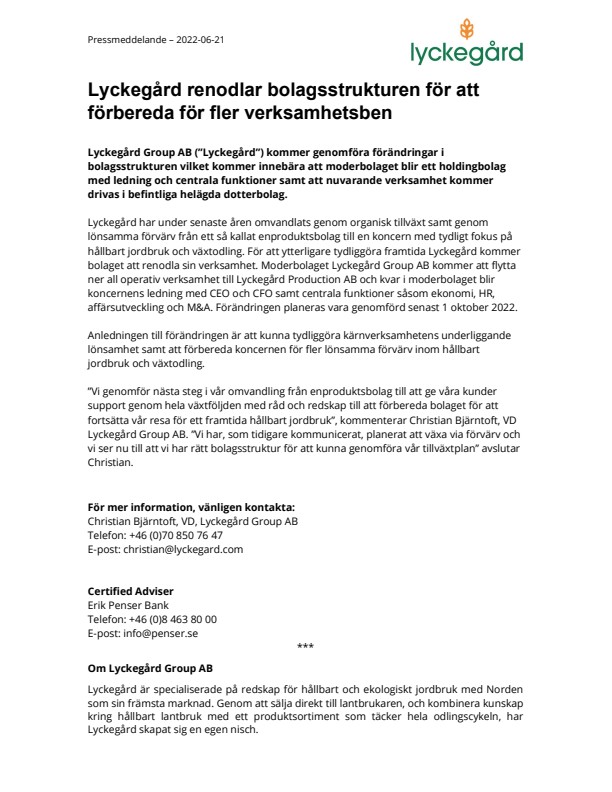 Lyckegård har under senaste åren omvandlats genom organisk tillväxt samt genom lönsamma förvärv från ett så kallat enproduktsbolag till en koncern med tydligt fokus på hållbart jordbruk och växtodling. För att ytterligare tydliggöra framtida Lyckegård kommer bolaget att renodla sin verksamhet. Moderbolaget Lyckegård Group AB kommer att flytta ner all operativ verksamhet till Lyckegård Production AB och kvar i moderbolaget blir koncernens ledning med CEO och CFO samt centrala funktioner såsom ekonomi, HR, affärsutveckling och M&A. Förändringen planeras vara genomförd senast 1 oktober 2022.