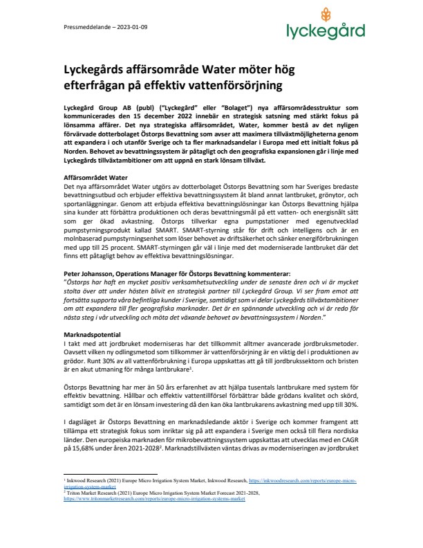 Lyckegård Group AB (publ) (“Lyckegård” eller “Bolaget”) nya affärsområdesstruktur som kommunicerades den 15 december 2022 innebär en strategisk satsning med stärkt fokus på lönsamma affärer. Det nya strategiska affärsområdet, Water, kommer bestå av det nyligen förvärvade dotterbolaget Östorps Bevattning som avser att maximera tillväxtmöjligheterna genom att expandera i och utanför Sverige och ta fler marknadsandelar i Europa med ett initialt fokus på Norden. Behovet av bevattningssystem är påtagligt och den geografiska expansionen går i linje med Lyckegårds tillväxtambitioner om att uppnå en stark lönsam tillväxt.