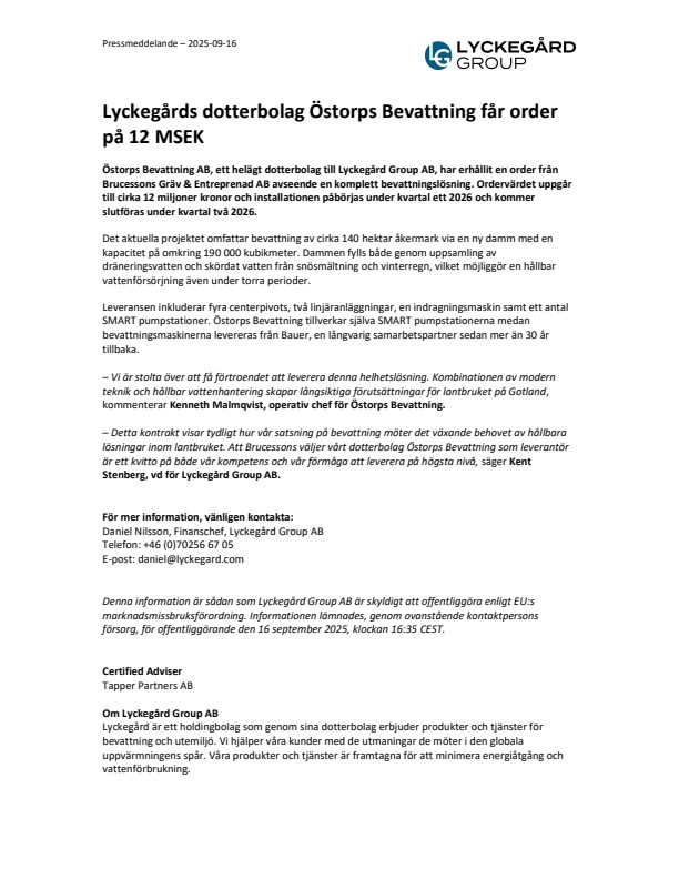 Östorps Bevattning AB, ett helägt dotterbolag till Lyckegård Group AB, har erhållit en order från Brucessons Gräv & Entreprenad AB avseende en komplett bevattningslösning. Ordervärdet uppgår till cirka 12 miljoner kronor och installationen påbörjas under kvartal ett 2026 och kommer slutföras under kvartal två 2026.