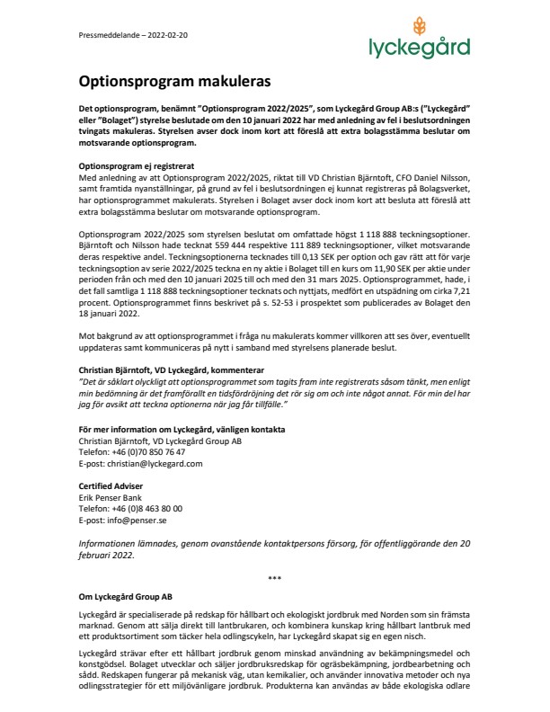 Det optionsprogram, benämnt ”Optionsprogram 2022/2025”, som Lyckegård Group AB:s (”Lyckegård” eller ”Bolaget”) styrelse beslutade om den 10 januari 2022 har med anledning av fel i beslutsordningen tvingats makuleras. Styrelsen avser dock inom kort att föreslå att extra bolagsstämma beslutar om motsvarande optionsprogram.